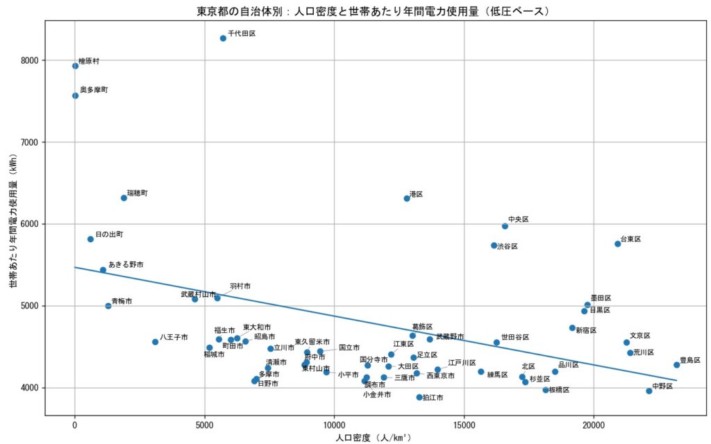 一般的に人口密度が高いエリアほど、世帯あたりの電力消費は小さくなる