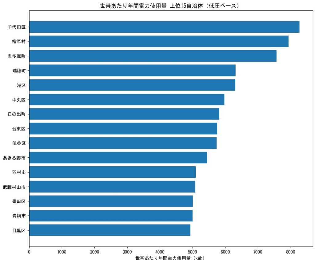 今回のデータでは家庭向けに近い「低圧電力」を使用していますが、この中には飲食店や小規模な店舗の電力も含まれます。都心ではこうした用途が多く、純粋な住宅消費よりも数値が大きくなりやすい傾向があります。
