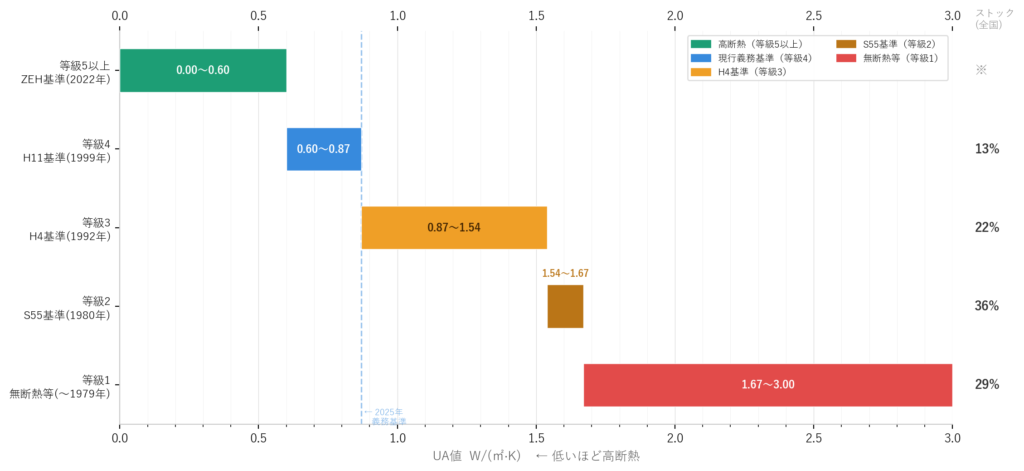 直感的な理解としては、UA値が0.1下がるごとに、一般的な戸建住宅