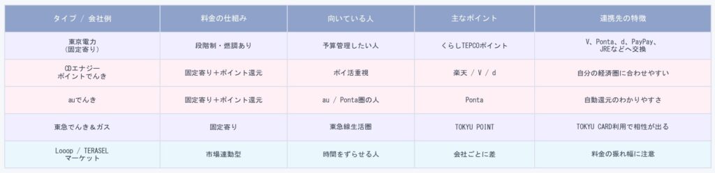 結論としてはシンプルです。家計を安定させたいなら固定型、電気を使う時間を調整できるなら市場連動型、普段の買い物と連携させたいならポイント重視型。