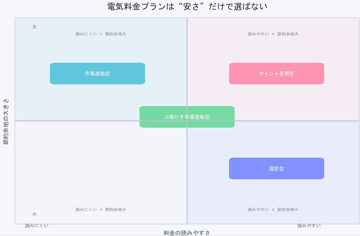 上限付き市場連動型という選択肢も出てきています。基本は市場価格に連動しつつ、一定以上の高騰には上限がかかる仕組みです。完全な固定よりは安さを狙いつつ、価格のブレを抑えたい人に向いているタイプです。