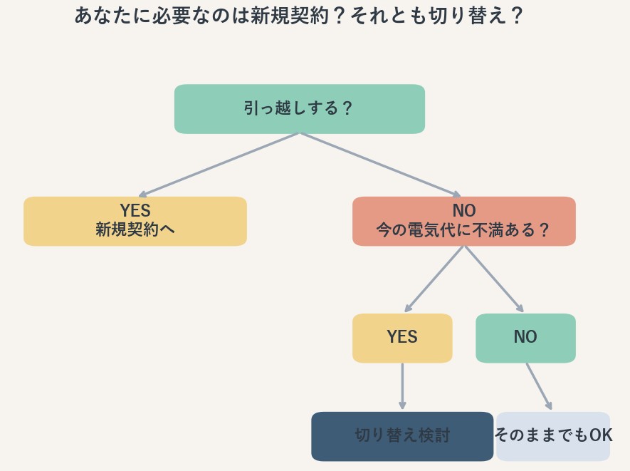 まず知っておきたいのは、電気の契約には「新規契約」と「切り替え」の2パターンがあることです。ここを分けて考えると、一気にわかりやすくなります。