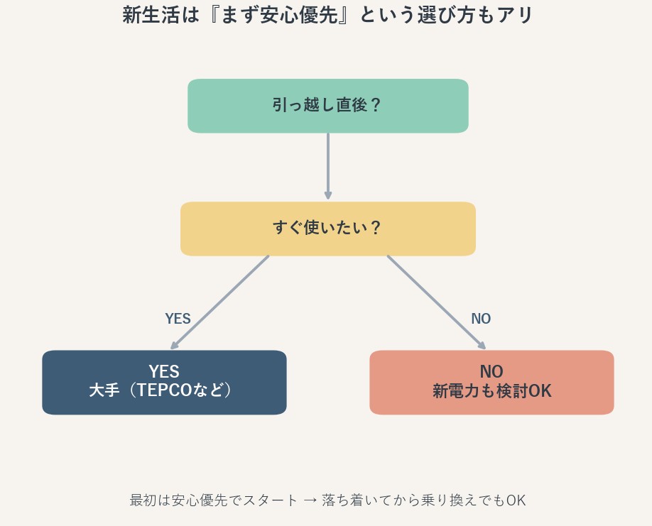 なので、新生活ではまず大手で確実にスタートして、生活が落ち着いてから改めて乗り換える、という考え方で十分です。電気契約は、一度決めたら一生そのままではありません。