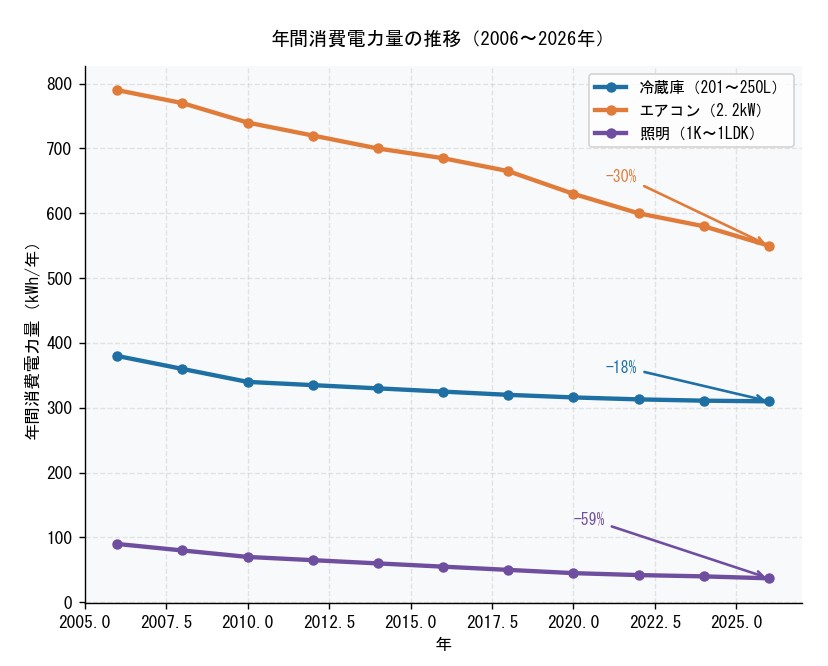 一人暮らしの6〜8畳の部屋に対応する2.2kWクラスのエアコン。2006年頃の期間消費電力量は約790kWhでしたが、2026年の最新機種では約550kWhまで低下しています。約30%の削減で、年間電気代の差は約6,660円です。 エアコンの省エネ化は1990〜2000年代に急進し、その後は伸びが緩やかになっています。