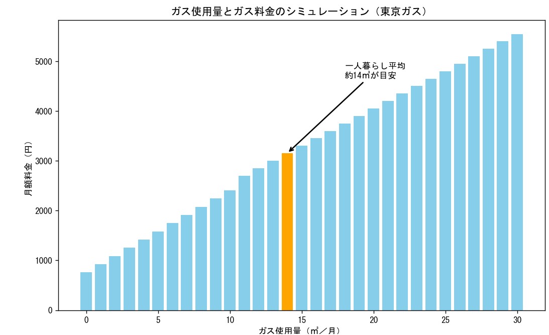 ※本シミュレーションは、東京ガスの一般料金(東京地区等)の料金表をもとに作成しています。